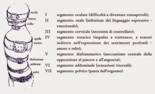 Reich individuò sette “segmenti corporei” in cui il corpo accumula tensioni croniche che bloccano il flusso dell’energia vitale.